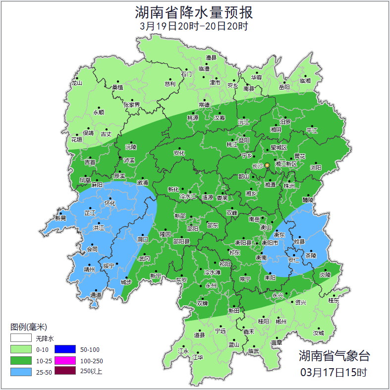 19日晚上至20日白天,阴天有小到中雨,其中怀化中南部、邵阳西部、株洲南部、衡阳东部局地大雨;北风2~3级;最低气温湘西8~10℃,其他地区11~13℃;最高气温15~18℃。