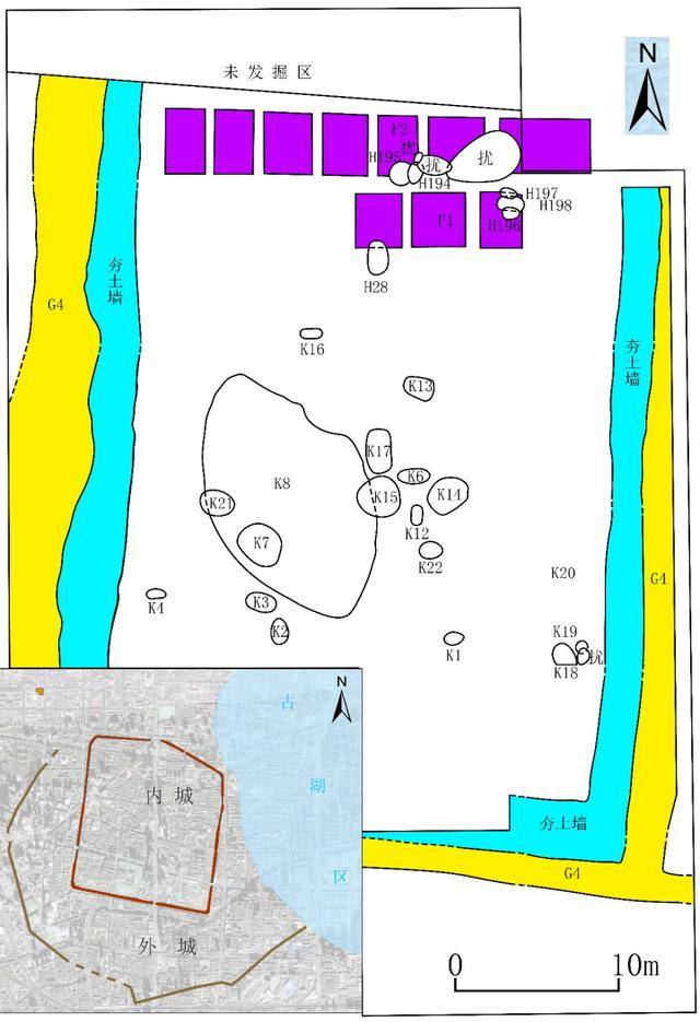 新发现的水系、作坊、府库、祭祀、墓葬等遗存,清晰的界定出内城南部功能分区:中南部为手工业作坊区,西南部为府库仓储区,西南角为祭祀区,东南部为高等级贵族墓葬区。布局规整、功能明确,充分展现早商都城规划有序、治理成熟的“纲维有序”特征。