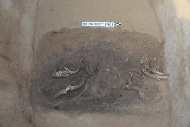 一处位于内城西墙外侧,发现一处夯土基址及由陶器、人牲、动物等祭祀坑组成的商代祭祀遗存,此处西距张寨南街铜器窖藏坑不足百米,是首次发现与青铜器窖藏坑有关的重要遗存,推进了对铜器窖藏坑埋藏性质的认知。