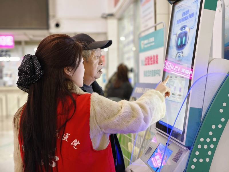 志愿者协助老年患者操作自助设备。蔡昀贝摄
