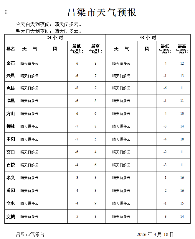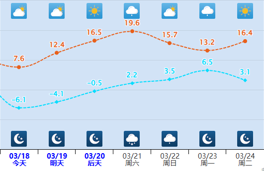 全市晴天间多云,最低气温-6~-1℃,最高气温10~16℃。