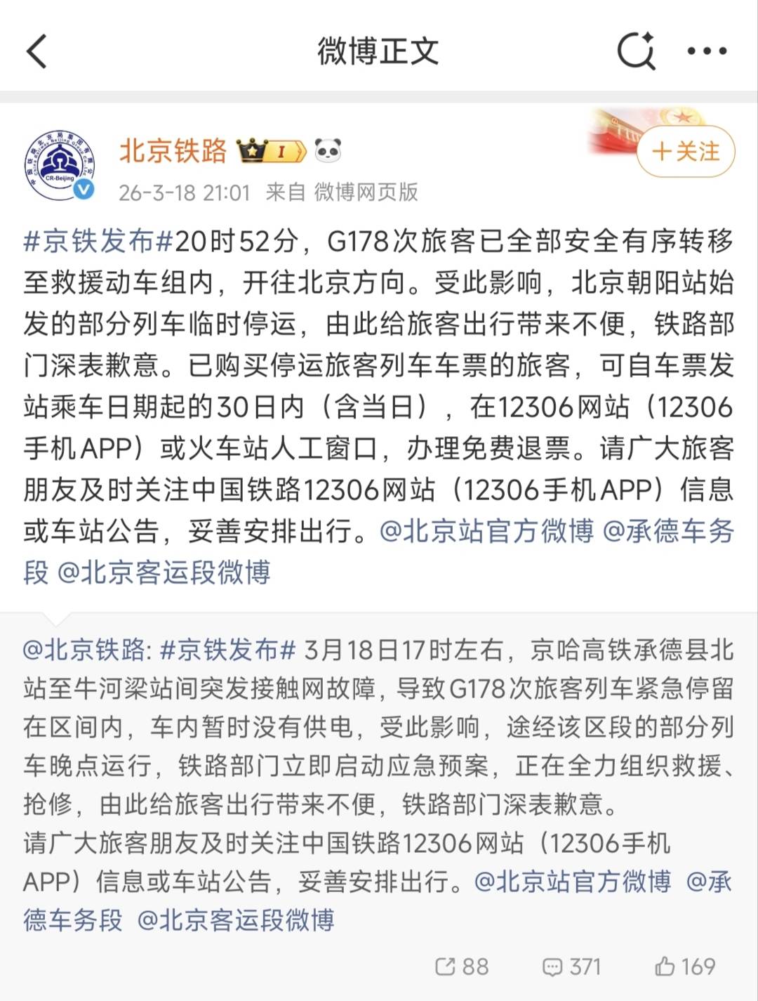 另据北京铁路消息,18日晚7时22分,铁路部门紧急安排的救援动车组和工作人员已赶到故障区段。18日晚8时52分,G178次旅客已全部安全有序转移至救援动车组内,开往北京方向。铁路部门表示,受此影响,北京朝阳站始发的部分列车临时停运,由此给旅客出行带来不便,深表歉意。已购买停运旅客列车车票的旅客,可自车票发站乘车日期起的30日内(含当日),在12306网站(12306手机APP)或火车站人工窗口,办理免费退票。