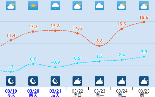 全市晴天,最低气温-8~-1℃,最高气温10~16℃。