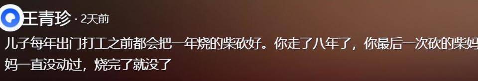 据悉,王女士的儿子因病去世8年,王女士接受采访表示:“我儿子已经走了8年的时间了,每一次他要出门打工之前,都要给我办好烧一年的柴,这堆柴一直8年了,我都舍不得烧。每次我就看到我这堆柴,就想起我儿子过年回家来。”