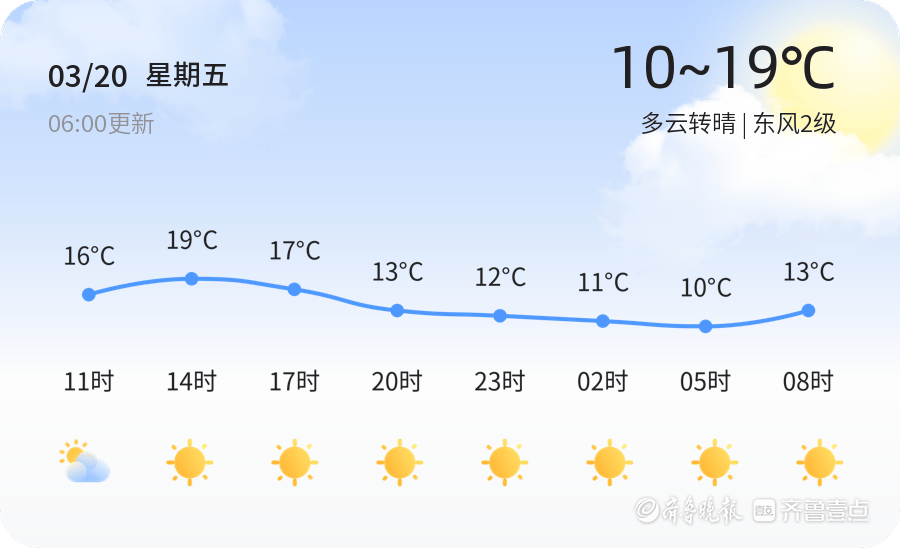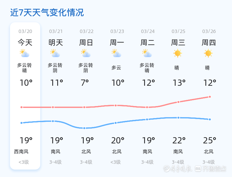 今天是2026年3月20日,星期五,农历二月初二,春分节气。今天济南天气以多云转晴为主,气温在10℃至19℃之间,东风2级,空气湿度76%,PM2.5指数98。今天是春分节气,昼夜平分,万物生长。春分时节天气转暖,昼夜温差较大,市民需注意适时增减衣物,以防感冒。今天济南各区天气总体晴好,北部地区偶有云层遮挡,南部地区阳光充足。明天济南天气多云转阴,风力有所增强,南风3-4级,气温在11℃至19℃之间。与今天相比,明天天气以多云为主,阴云覆盖范围较大,风力较今天有所增强,但气温变化不大。未来三天济南天气以多云为主,部分地区有阴天,风力维持在3-4级,气温在7℃至19℃之间。预计22日天气多云转阴,风力较大,市民出行需注意防风保暖。23日至24日天气以多云为主,偶有晴天,气温逐渐回升。温馨提示