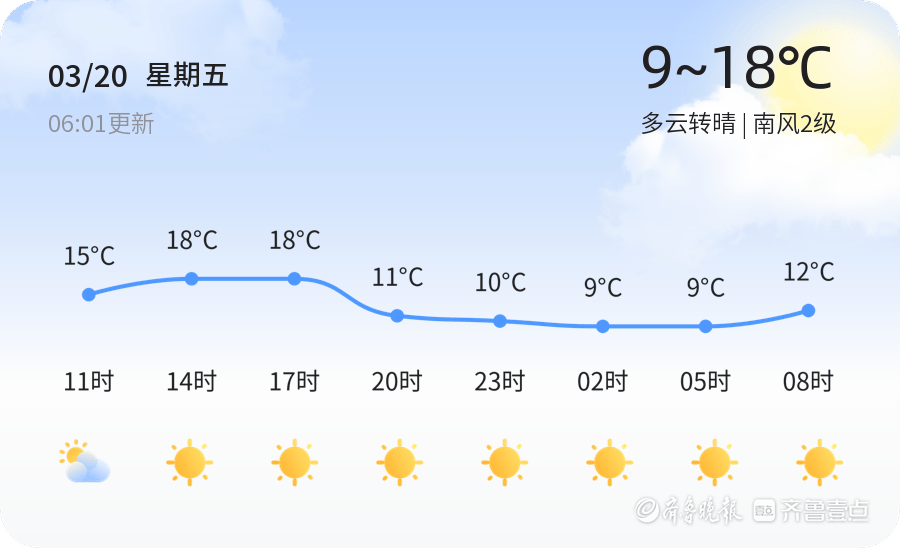 今天是3月20日,星期五,农历二月初二,我们迎来了二十四节气中的春分。春分是春季的第四个节气,标志着昼夜平分,天气逐渐回暖。今天淄博市的天气以多云转晴为主,气温在9℃到18℃之间,南风2级,空气湿度87%。各区县天气情况总体平稳,市民可以放心出行,享受春日的温暖阳光。春分时节,昼夜温差较大,市民应注意适时增减衣物,防止感冒。