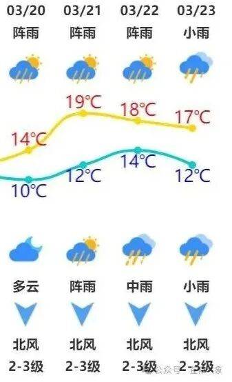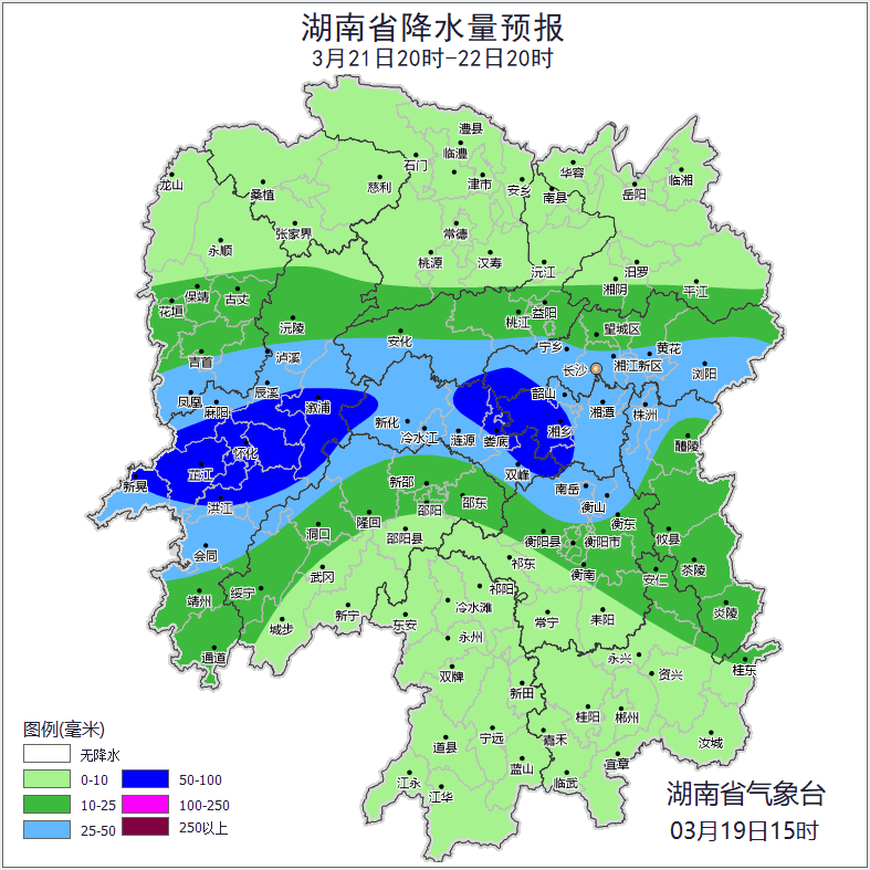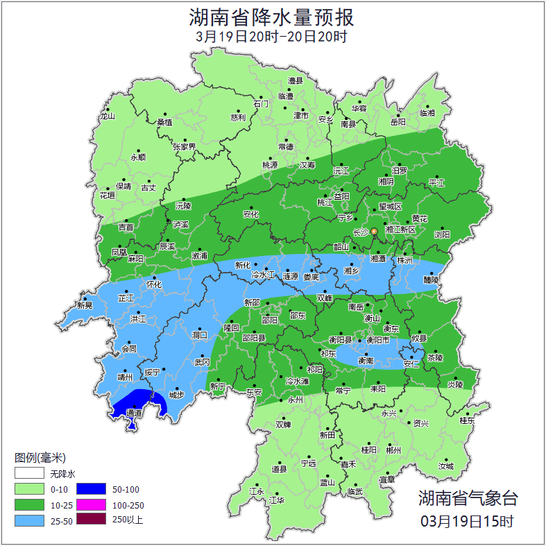 3月20日白天,全省阴天有小到中雨,其中湘中部分地区大雨,怀化(通道)、邵阳(城步)暴雨 ;北风2~3级;最低气温湘西8~11℃;最高气温湘南15~18℃,其他地区12~14℃。