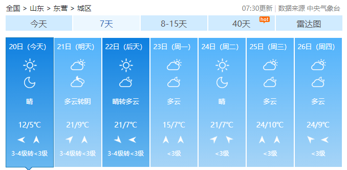 20日白天到夜间,全省天气晴间多云。半岛地区北风转南风3~4级,其他地区南风3级左右。夜间最低气温:鲁中山区和半岛内陆地区2℃左右,有霜冻,临沂和日照4℃左右,有霜冻或轻霜冻,其他地区6℃左右。最高气温:沿海地区12℃左右,其他地区17℃左右。