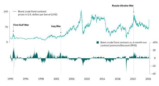 先锋商品策略基金的投资组合经理Fei Xu指出,油价和基于市场的地缘政治风险溢价的飙升幅度,已迅速逼近1990年第一次海湾战争和2022年俄乌冲突期间的水平。当时,油价和风险溢价急剧上升,并在高位维持数月,直到供应状况稳定后才逐渐回落。