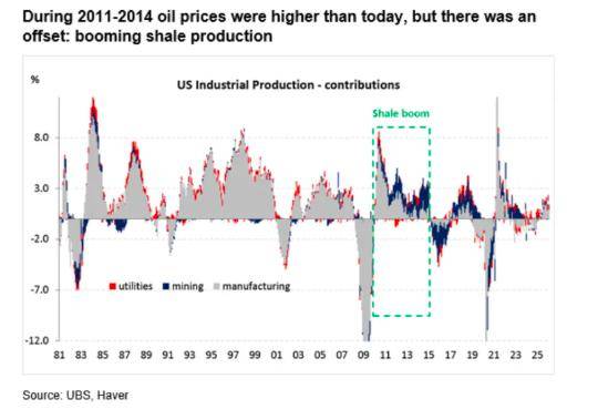 Kapteyn写道,经通胀调整后,2011-2014年的油价实际上比现在更高,但当时美国经济吸收了那次冲击,因为页岩油热潮为工业基础提供了助力。当时飙升的WTI原油价格刺激了油气公司增加钻探活动、产量增长和能源部门投资。这为美国的制造业基础创造了助推力,并抵消了部分高燃料成本带来的拖累。