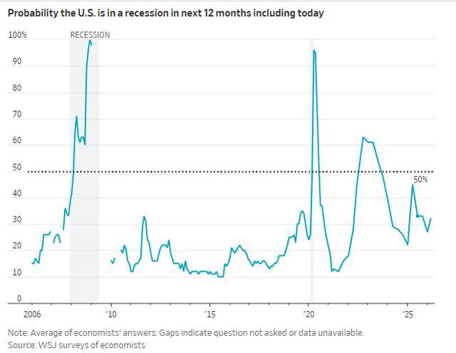 根据媒体本周对经济学家进行的一项调查显示,在中东战事步入第三周之际,未来12个月美国经济陷入衰退的概率最新为32%,略高于1月份预测的27%。