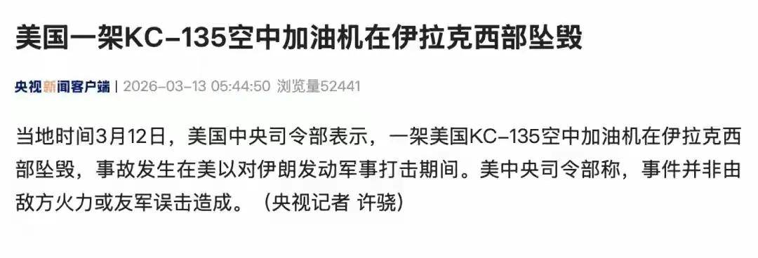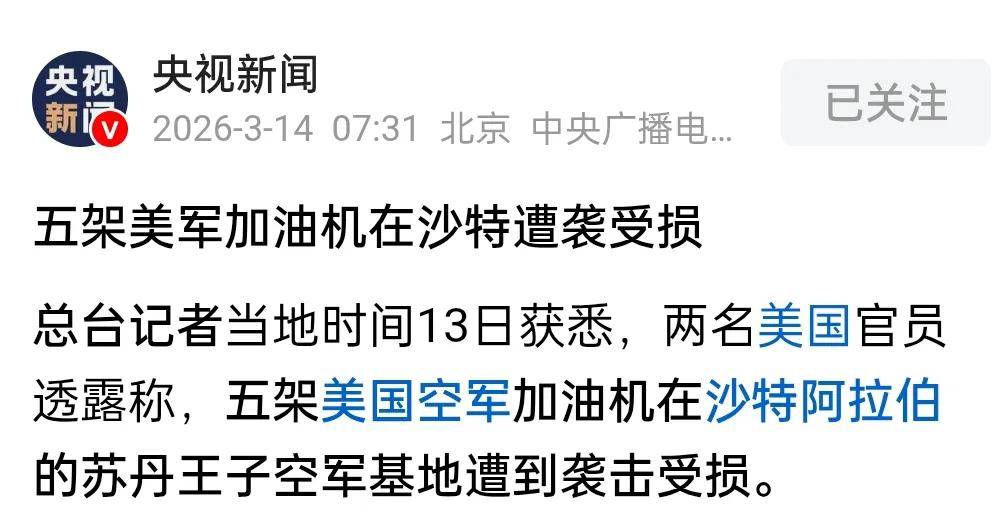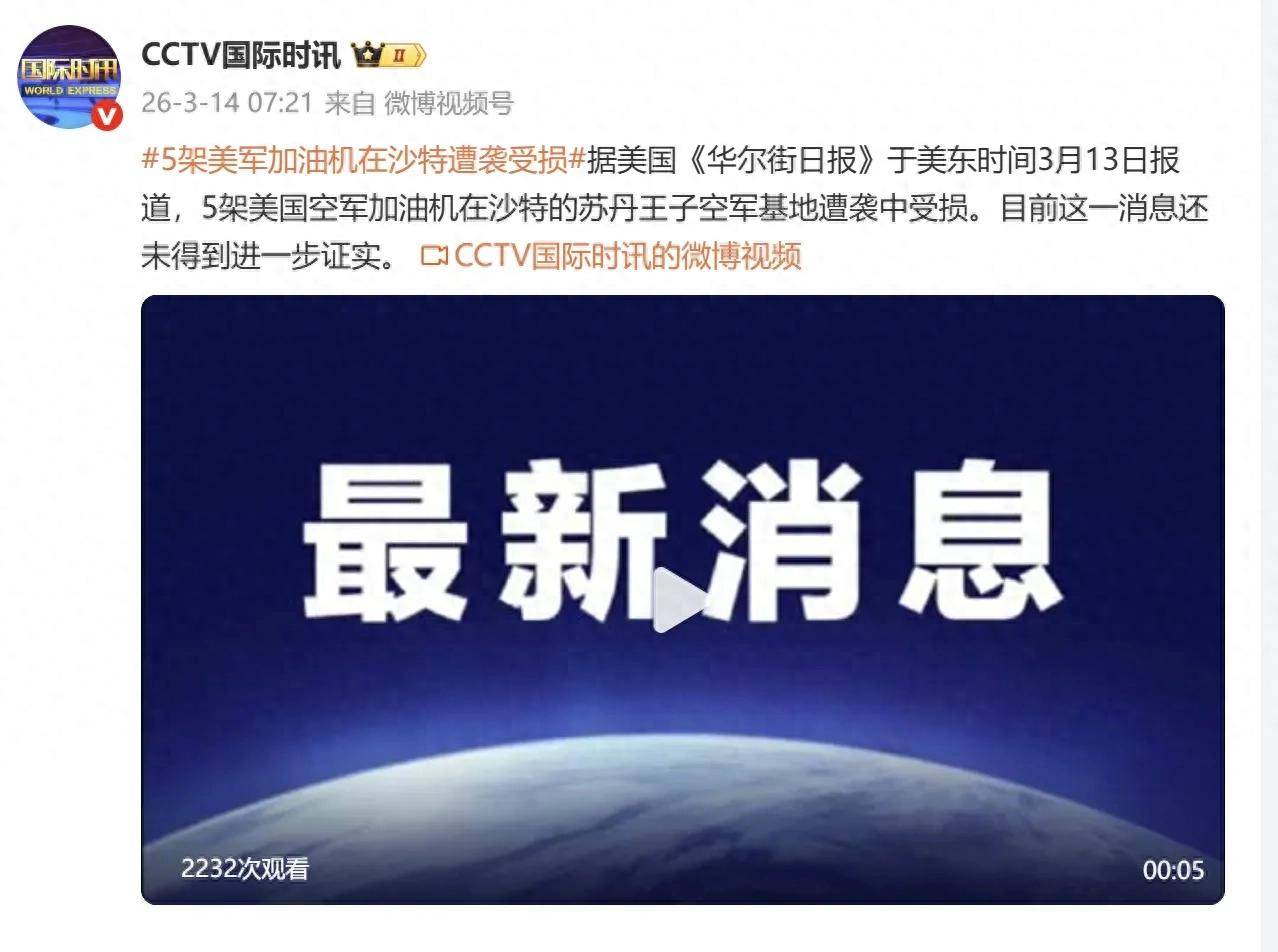 消息来源:《央视新闻》3月14日报道《五架美军加油机在沙特遭袭受损》