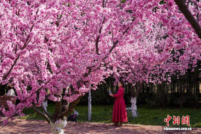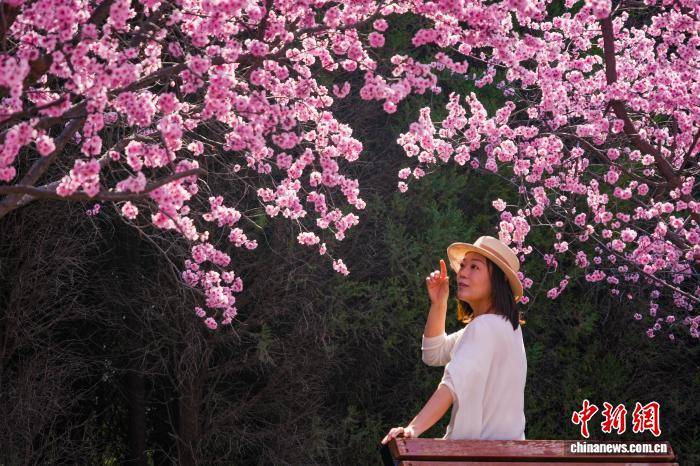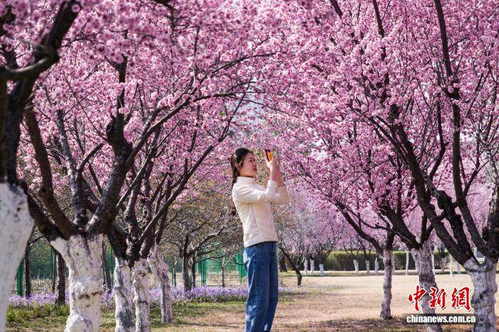 3月20日,河南郑州,市民在美人梅下拍照。当日正值春分节气,市民来到郑州植物园踏青赏花,乐享春日时光。中新社记者 范晓恒 摄