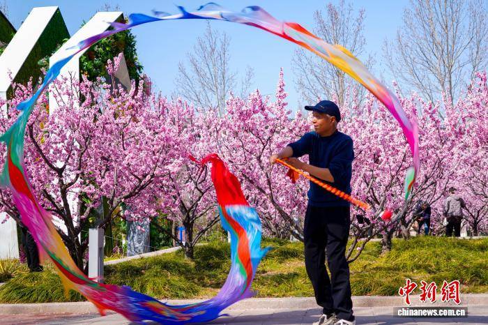 3月20日,河南郑州,市民在花间挥舞彩带进行健身活动。当日正值春分节气,市民来到郑州植物园踏青赏花,乐享春日时光。中新社记者 范晓恒 摄