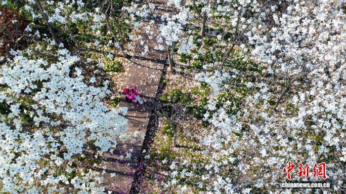 3月20日,河南郑州,市民在玉兰花树下拍照。当日正值春分节气,市民来到郑州植物园踏青赏花,乐享春日时光。(无人机照片)中新社记者 范晓恒 摄