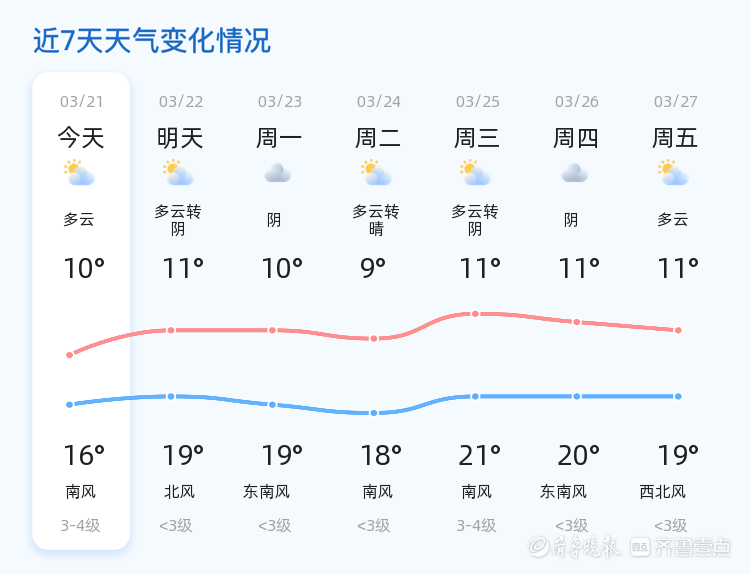 今天是3月21日,星期六,农历二月初三。济宁市天气以多云为主,气温在10℃至16℃之间,东南风2级,相对湿度为93%,PM2.5指数为138。各区县天气状况基本一致,均为多云,气温略有波动,但整体舒适宜人。市民朋友们可以适当增加户外活动,享受春日的温暖阳光。