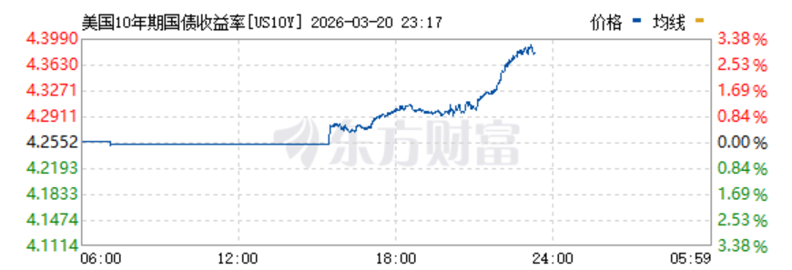 当地时间3月20日,美国国债再次遭遇大量抛售。美国10年期国债收益率突然跳涨,截至发稿已逼近4.39%,涨幅超3%。