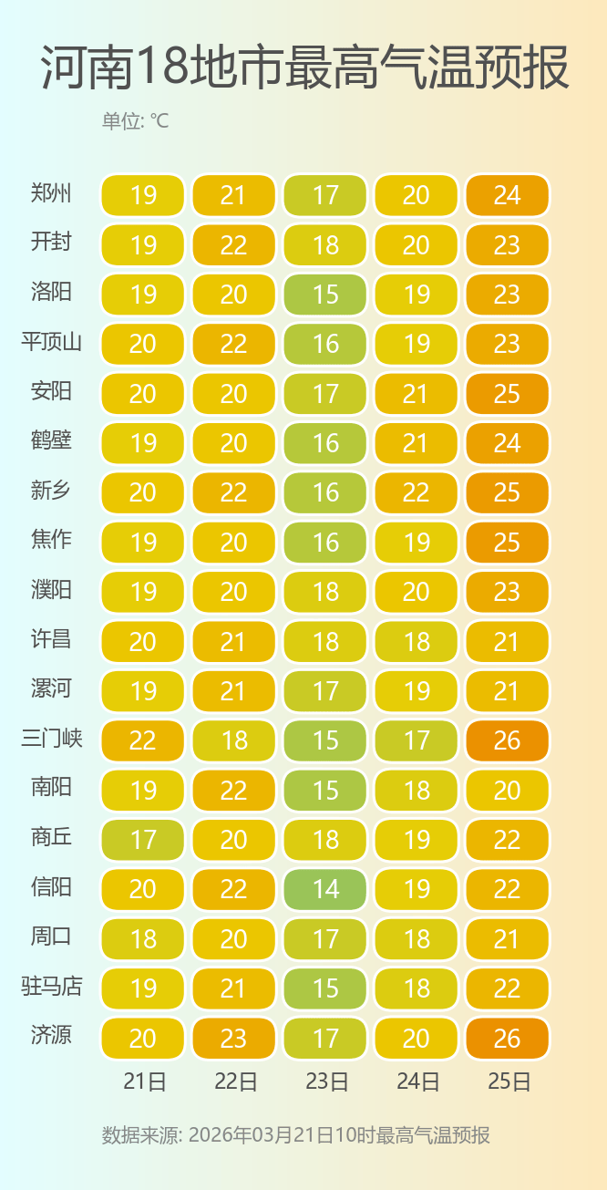 记者从河南省气象台了解到,预计今天河南全省大部最高气温接近20℃,暖意十足。明天气温继续攀升,将迎来近期高点,多地午后气温超20℃,春日氛围感拉满。