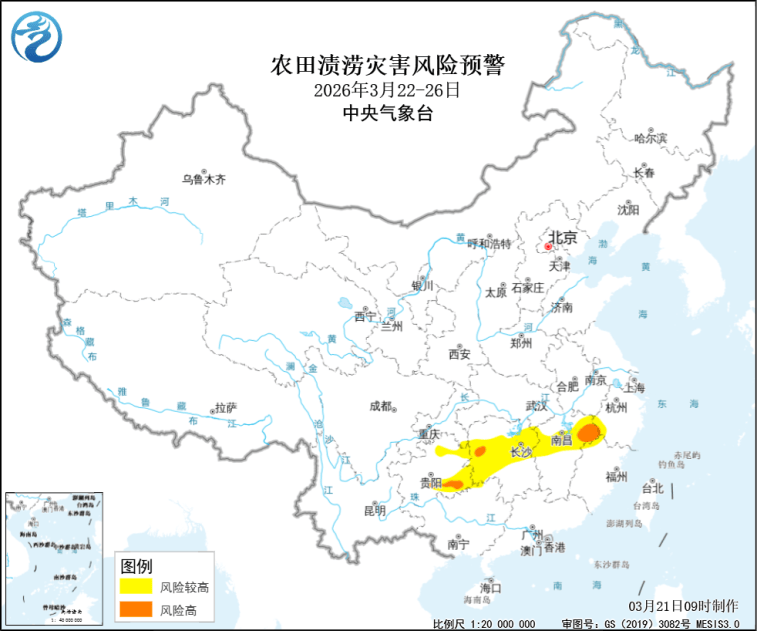 农业农村部和中国气象局2026年3月21日联合发布农田渍涝灾害风险预警:预计3月22日至26日,江汉东部、江淮西南部、江南西部和北部、西南地区东南部及广西北部等地有中到大雨,局地暴雨。贵州东部、湖南中部、江西中部和东北部等地农田渍涝灾害风险较高;贵州黔南中部和黔东南西南部,湖南怀化西部和湘西东南部,江西宜春东部、鹰潭东部及上饶南部等地农田渍涝灾害风险高。建议:降水偏多地区做好库塘蓄水,加强沟渠疏通和排水降渍。