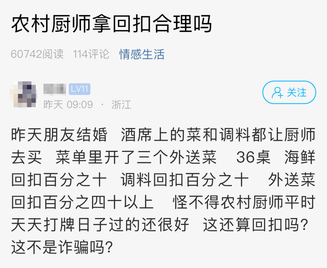 网友@我要验牌:回扣都有的,提前说清楚就行,货比三家,尽量找年轻厨师,吃相没这么难看。