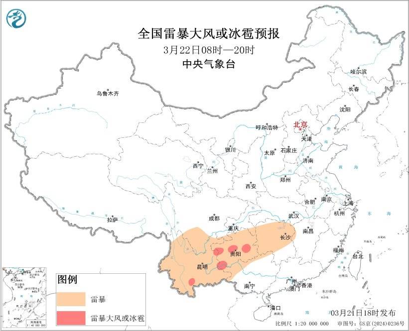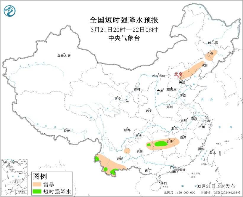 预计3月21日20时至22日20时,湖南中西部、贵州中南部、云南中西部等地的部分地区将有短时强降水天气,小时雨量20-30毫米,局地可达30毫米以上;贵州中南部、云南西南部、广西西北部等地的局地将有雷暴大风或冰雹天气;另外,辽宁中西部、吉林中部、河北东北部、北京东部、天津北部、湖南中北部、贵州、四川南部、云南等地的部分地区将有雷暴。