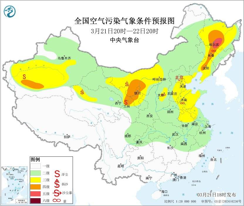 21日夜间至23日,区域南部大气扩散一般,陕西关中地区有短时轻度霾,24日起,受降水天气影响,上述地区大气扩散和湿清除条件逐渐好转,无明显霾天气。