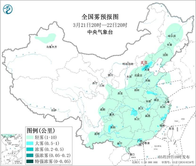 21日夜间至22日上午,华北东部、黄淮东部、东北地区大部有轻度霾,部分地区有中至重度霾;河北中部、天津大部、山东东部沿海、江苏北部、安徽北部、湖南北部等地的部分地区有大雾,局地有能见度不足500米的浓雾;22日中午起,受冷空气影响,上述地区雾霾天气逐渐减弱消散。此外,21日夜间至22日,新疆南部、内蒙古西部、宁夏中北部、甘肃中部、青海西北部等地的部分地区有扬沙或浮尘天气。