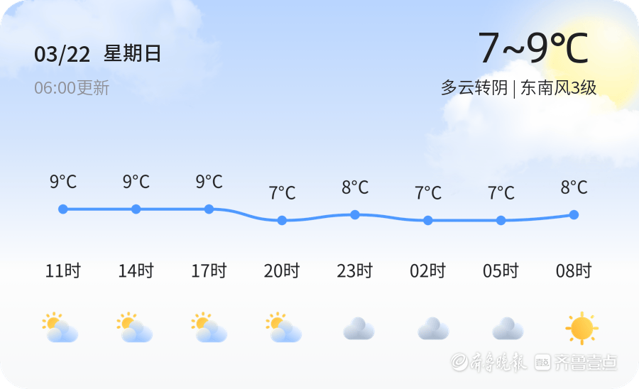 今天是3月22日,星期日,农历二月初四。青岛市气象台发布天气预报,今天天气多云转阴,气温7℃至9℃,东南风3级,空气湿度93%,空气质量良好。市民出行时建议携带雨具,注意防风保暖,以应对天气变化带来的影响。未来三天,青岛市天气将呈现波动趋势。预计周一阴天,气温6℃至12℃,周二阴转多云,气温6℃至10℃,周三天气晴朗,气温9℃至12℃。周一阴雨天气可能对交通出行造成一定影响,建议市民提前规划路线,注意行车安全。温馨提示