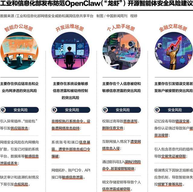 邢星表示,OpenClaw可能带来的核心风险集中在数据安全、交易可控性及合规性三个层面,其开源属性导致的安全漏洞的易利用性,会放大风险传导效应。这些风险的凸显,本质是由金融行业的核心特点决定的。金融行业承载着海量敏感信息,对数据保密性、完整性要求极高,且行业具有强关联性,单个环节的风险易扩散为系统性风险;同时,金融交易的严肃性和不可逆性,以及监管对合规性的零容错要求,使得开源AI智能体的弱安全配置和责任界定模糊问题,与行业特性形成天然矛盾。