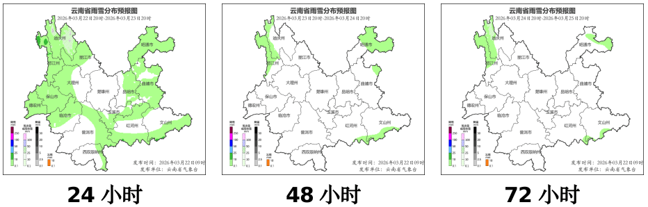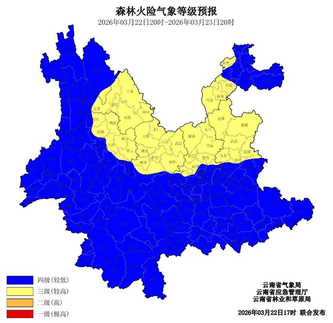预计2026年3月22日20时至3月23日20时,丽江市中东部、大理州东部、楚雄州中北部、昆明市北部、曲靖市中北部、昭通市中南部三级(较高),其他地区四级(较低)。