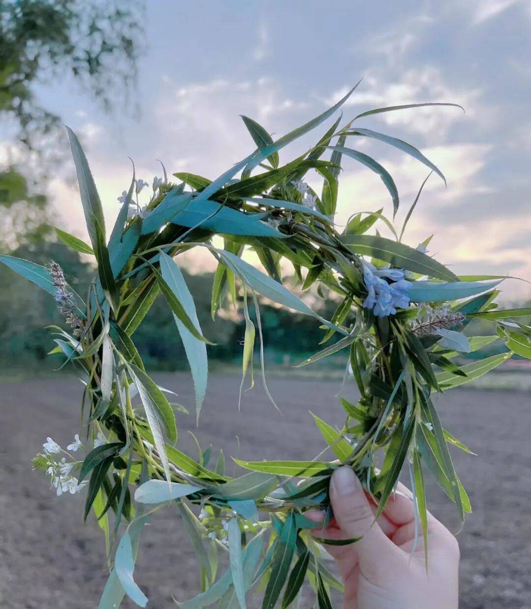 编个花环,一些柳枝缠绕成一个圈儿,郁郁葱葱,戴到头上,柳树特有的青气,萦绕在身边。
