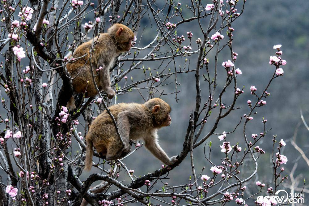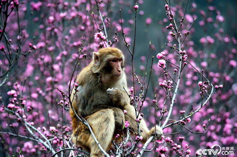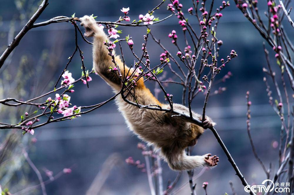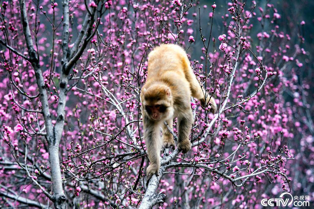 3月23日,河南济源,五龙口太行猕猴自然保护区内,太行猕猴在春天的花丛中嬉戏觅食,享受美好春光。来源:央视网