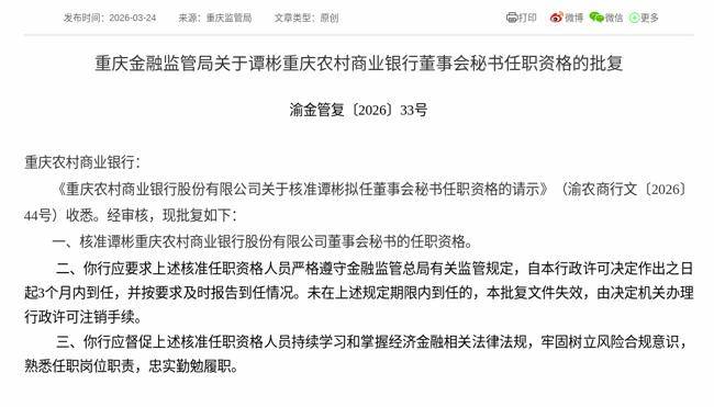 2026年3月24日,根据国家金融监督管理总局消息,《重庆农村商业银行股份有限公司关于核准谭彬拟任董事会秘书任职资格的请示》获得通过,批复谭彬重庆农村商业银行股份有限公司董事会秘书的任职资格。