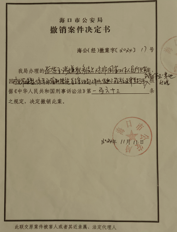 2021年,当地检察机关介入监督后,海口市公安局以涉嫌职务侵占罪、对非国家工作人员行贿罪,再次对尚选玉立案侦查。可三年后,海口警方再次撤案,理由是办案时间已超过相关规定的二年期限。