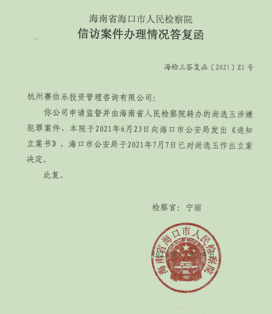 2021年6月,尚选玉涉嫌犯罪案件经海南省检察院转办后,由海口市检察院发出《立案通知书》。当年7月,海口市公安局以涉嫌职务侵占罪和对非国家工作人员行贿罪,对尚选玉立案侦查。