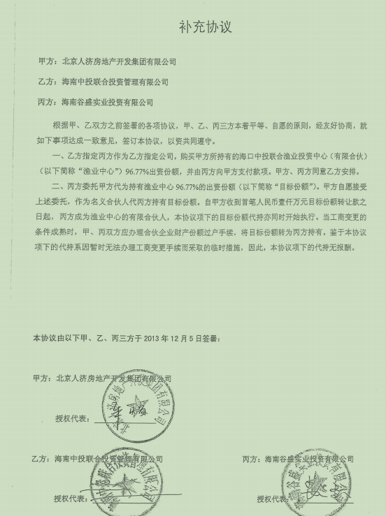 一周后,甲乙双方与尚选玉实际控制的海南谷盛公司(丙方)签订补充协议,由丙方购买甲方的出资份额。2014年5月底之前,海南谷盛公司向北京人济公司支付5000万元获得相关出资份额。