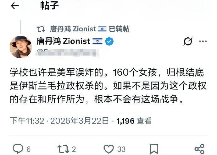 上一次是2023年哈马斯突袭以色列之后,唐丹鸿对于以色列在加沙犯下的滔天罪行只字不提,反而发帖称“哈马斯挨家挨户进屋用机枪扫射”......