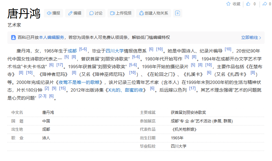 公开信息显示,唐丹鸿虽远嫁以色列并定居以色列,可是却仍是中国国籍,1985年生成四川成都,是诗人、纪录片编导,是所谓的20世纪90年代中国女性诗歌的代表。