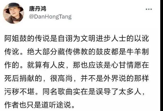 她赫然把农奴制下农奴主把农奴女孩的人皮活剥下来制成“阿姐鼓”,描述成或者是牛羊皮制成或者是农奴女孩心甘情愿死后捐献,甚至说什么同名歌曲“自诩为文明进步人士的以讹传讹”、“误导了太多人”。
