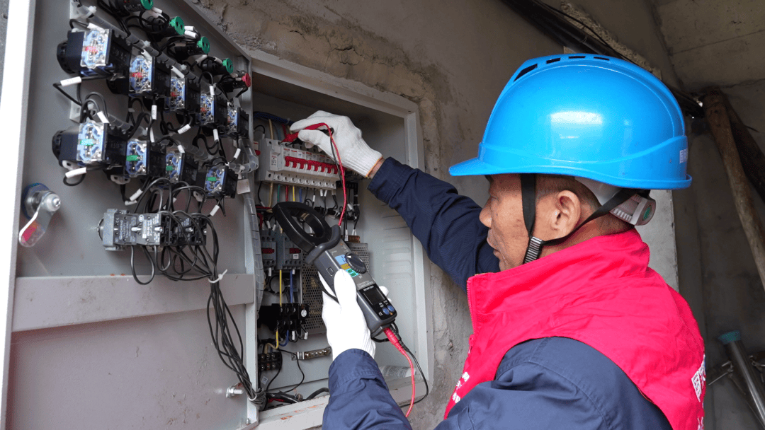在寺坪镇庹家坪村蔬菜种植基地,工作人员手持钳式万用表仔细测量配电箱电压数据,耐心向农户讲解抽水电机的安全操作要领,为灌溉用电增添一份保障。