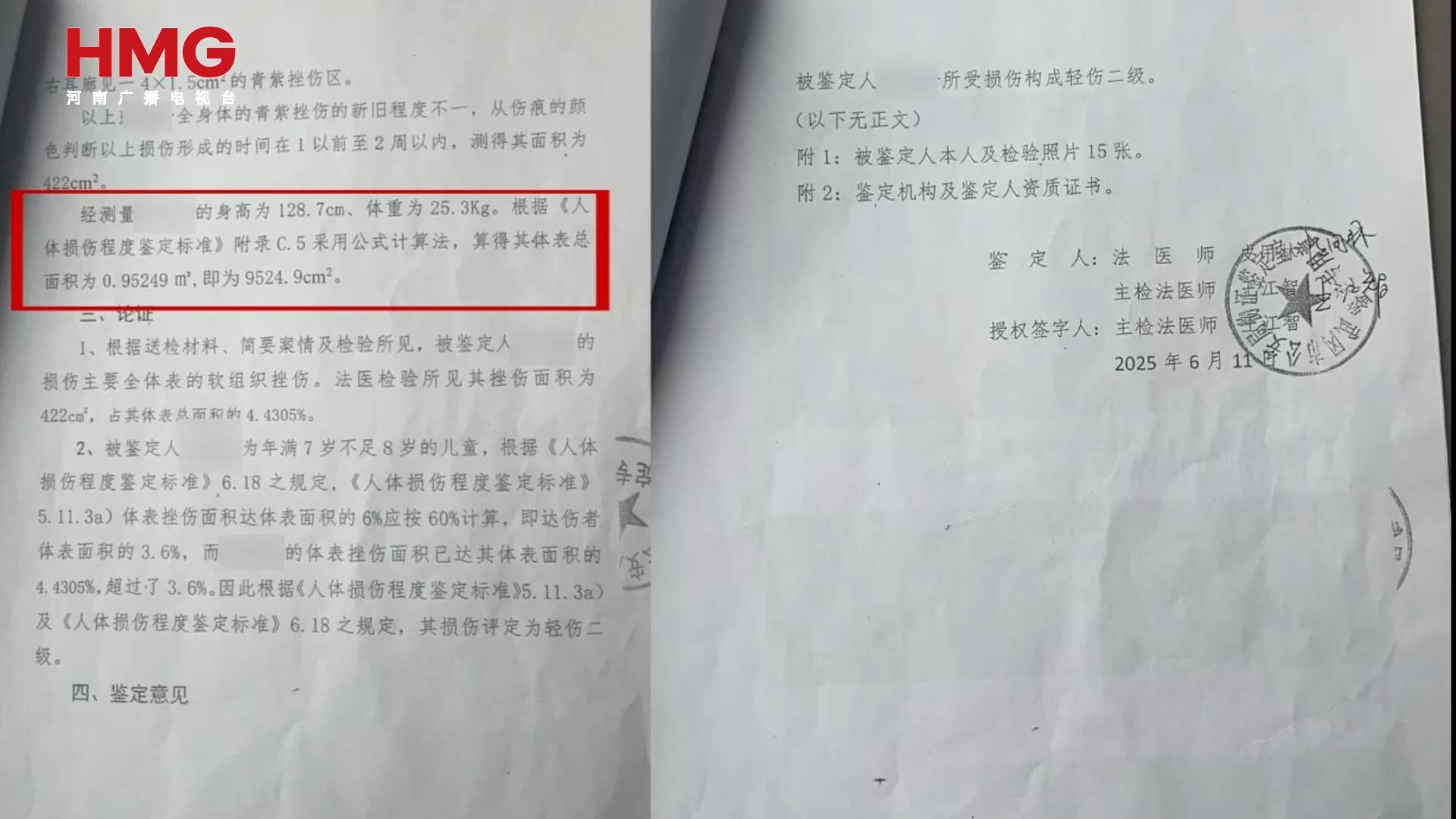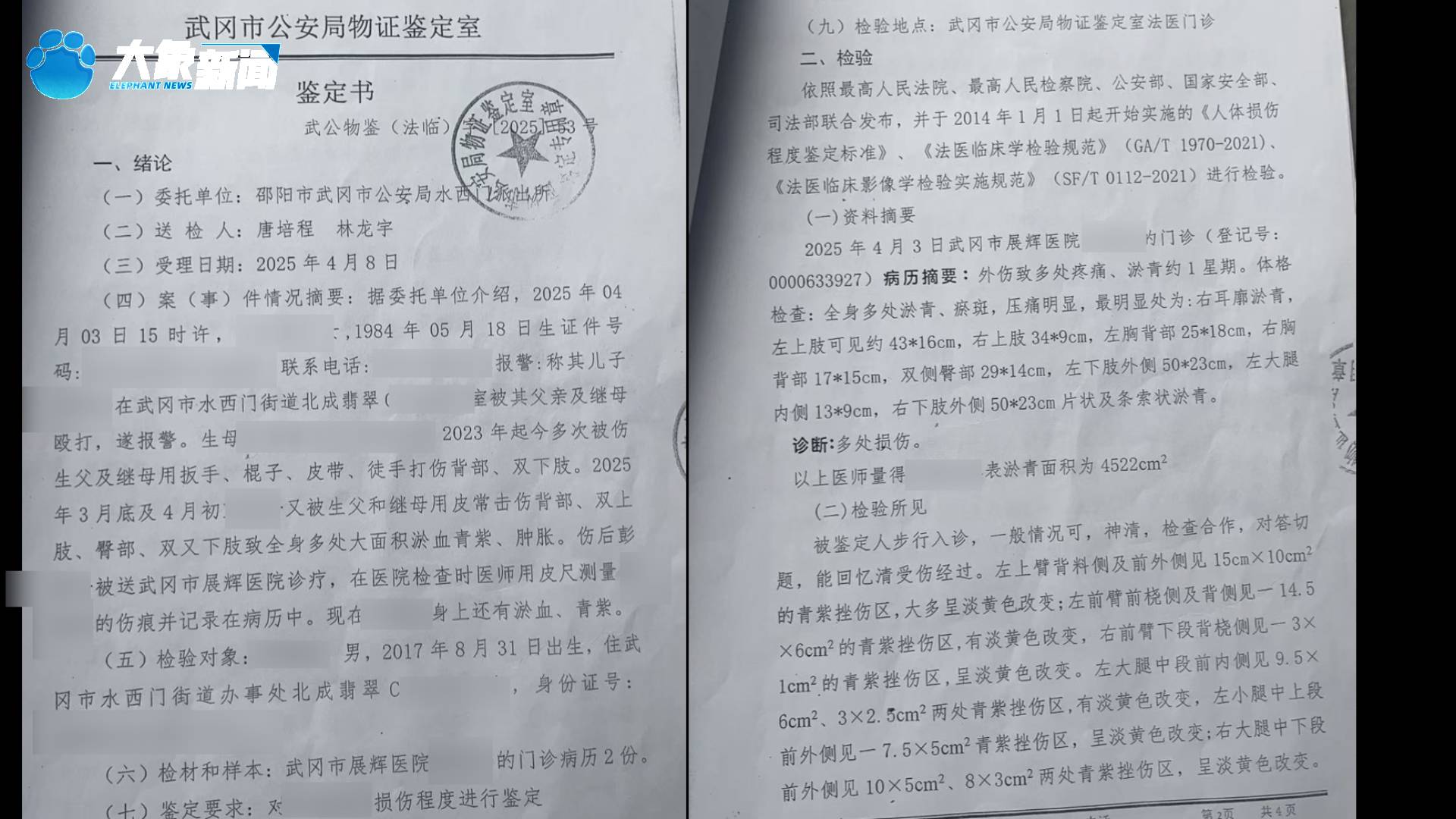 武冈市公安局出具的鉴定书显示:医生诊断测量孩子体表瘀青面积达4522cm²,而小元宝体表总面积约为9525cm²。瘀青面积超过了孩子体表总面积的47%!