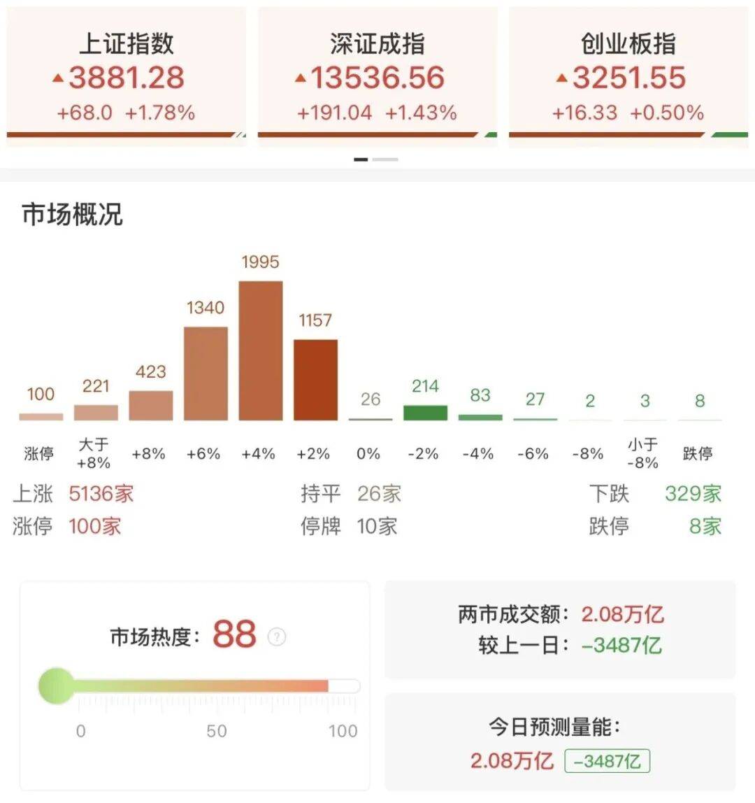 今日A股市场全天探底回升,沪指、深成指均涨超1%,创业板指尾盘翻红,此前一度跌近2.5%。黄白线分化明显,微盘股指数大涨超5%。沪深两市成交额2.08万亿,较上一个交易日缩量3487亿。