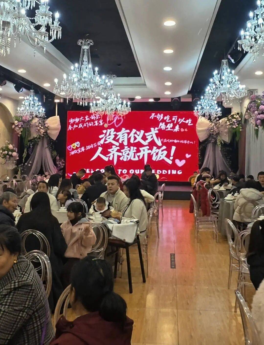 值得一提的是,婚礼现场的屏幕上,主题画面更是直接——“没有仪式,人齐就开饭”,红底白字,热闹喜庆又简单。还用小字标注了一些信息“谢谢大家来参加我们的喜宴”“大家吃好喝好玩得开心”“不够吃可以吃隔壁桌”……