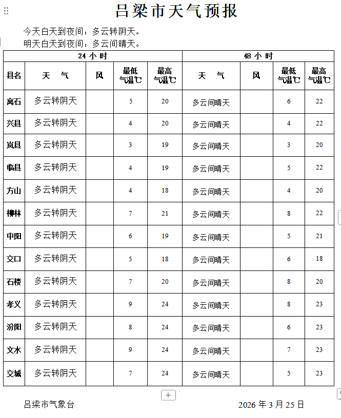 全市多云转阴天,最低气温3~9℃,最高气温19~24℃。