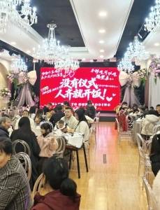 值得一提的是,婚礼现场的屏幕上,主题画面更是直接——“没有仪式,人齐就开饭”,红底白字,热闹喜庆又简单。