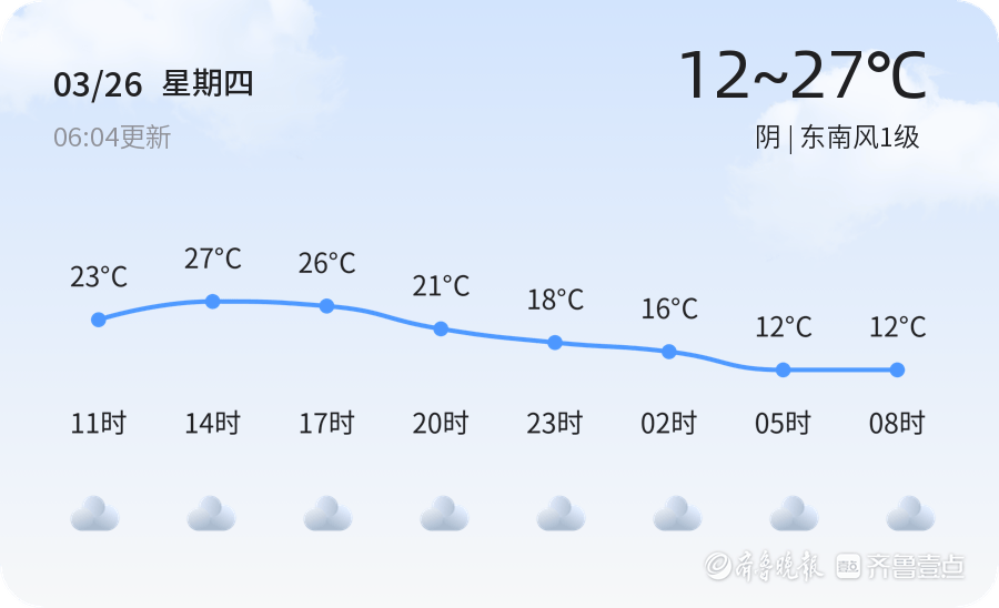 今天是3月26日,星期四,农历二月初八。潍坊市今日天气阴,气温在12℃至27℃之间,东南风1级,空气湿度75%,PM2.5指数为123。目前实时温度11℃,阴天,风力较小,体感略凉。各区天气情况总体一致,均为阴天,气温略有差异但变化不大。明天潍坊天气将由阴转多云,气温有所下降,预计在9℃至21℃之间,北风3-4级。与今日相比,明日天气以多云为主,风力有所增强,气温明显降低,市民出行需注意保暖。未来三天,潍坊市天气将呈现阴转小雨的趋势。周六阴转小雨,气温11℃至27℃,东南风3-4级;周日多云转阴,气温8℃至23℃,东南风<3级;周一多云,气温5℃至18℃,北风3-4级。降雨天气可能带来道路湿滑,市民需注意出行安全,及时添减衣物,防范感冒。温馨提示