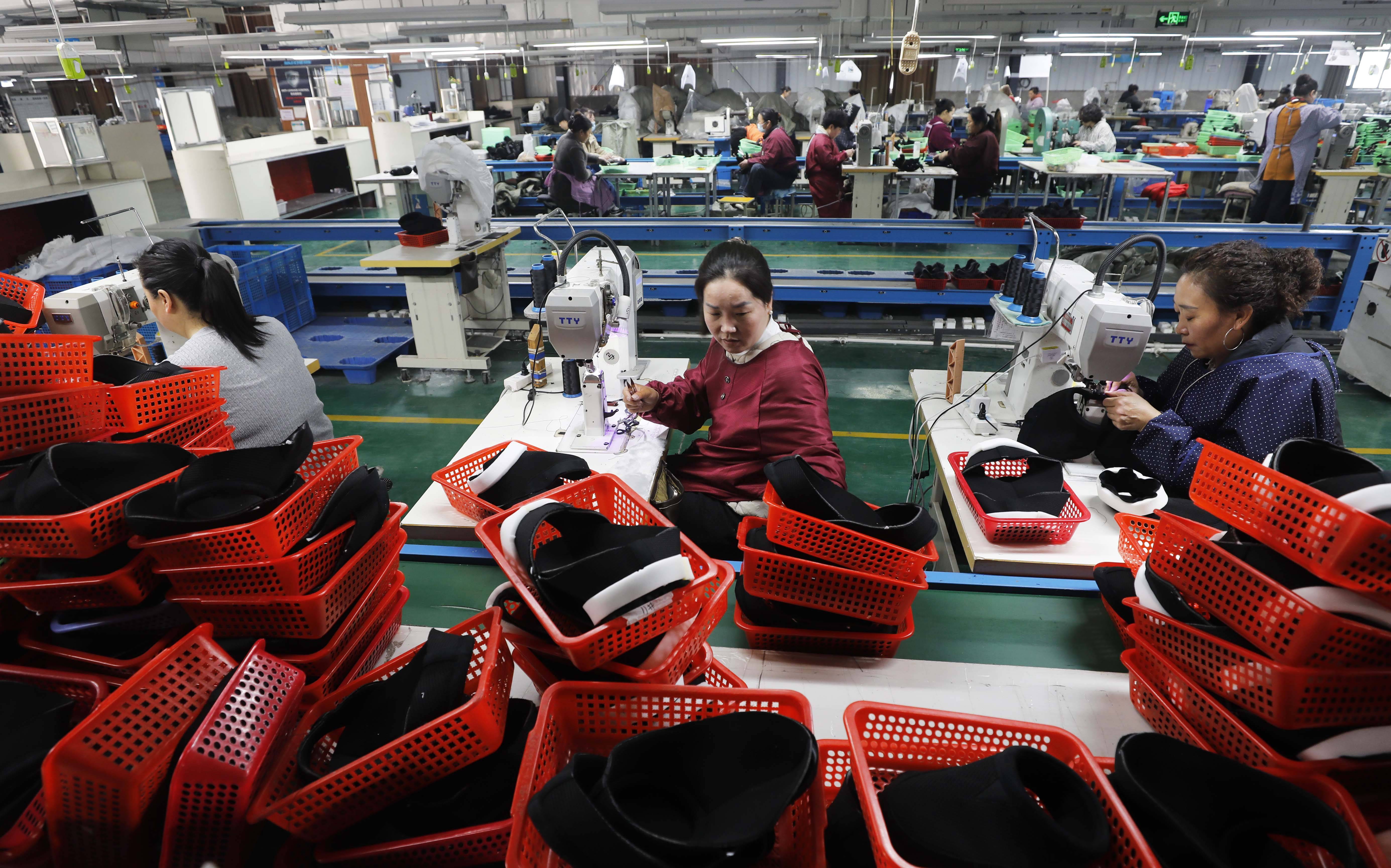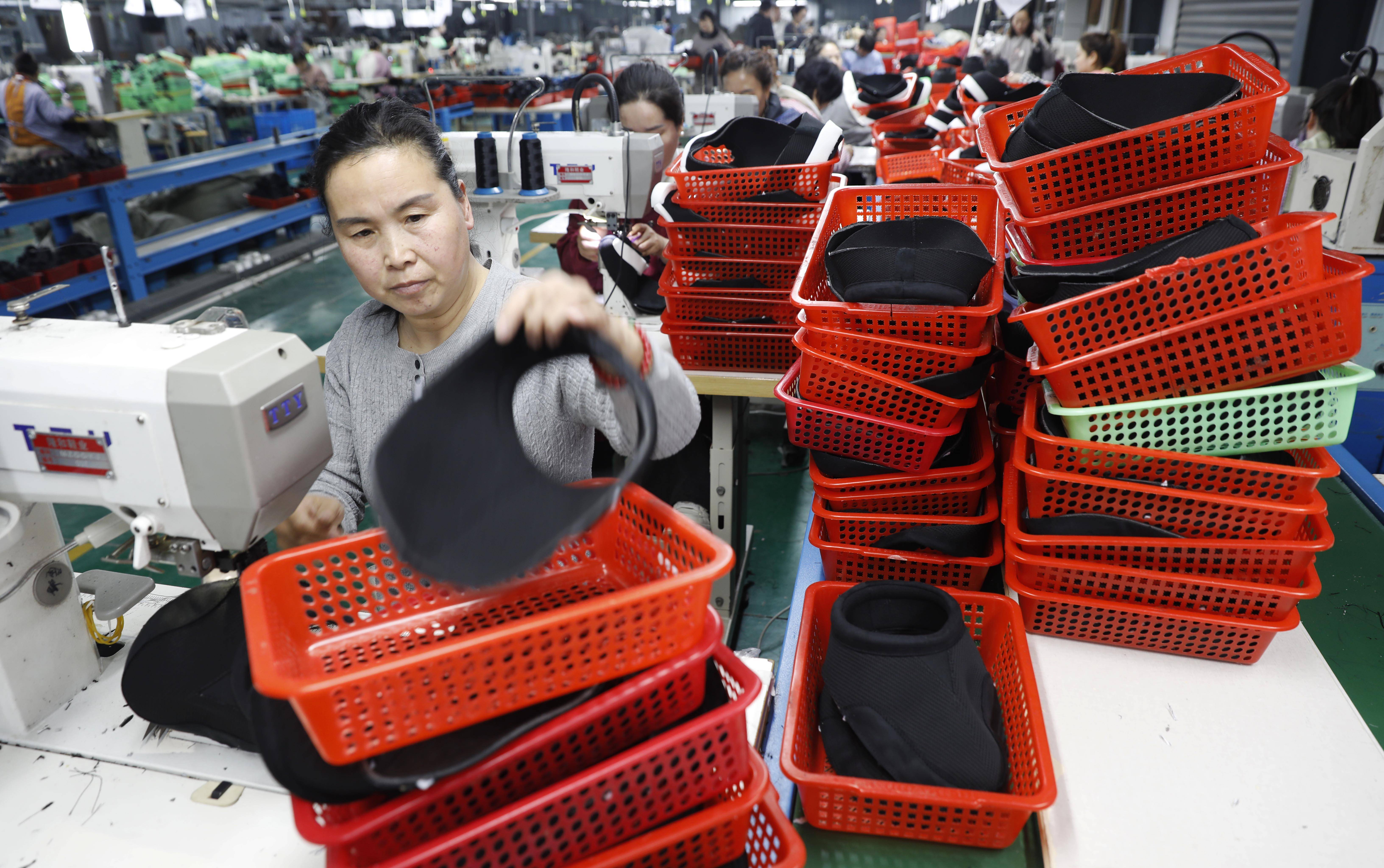 3月27日,工作人员在河南省武陟县隆和鞋业公司车间内加紧生产。 新华社发(冯小敏摄)