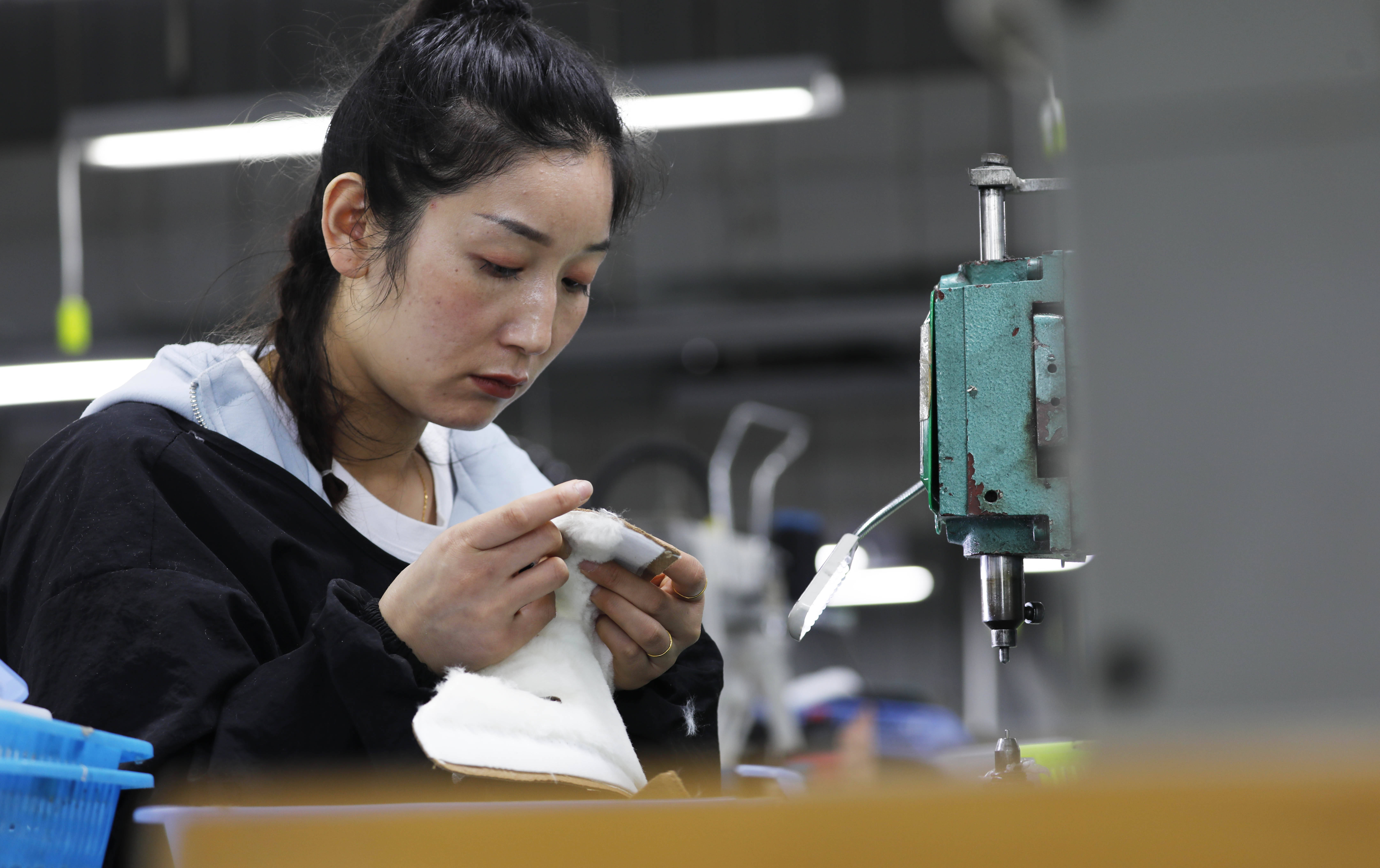 3月27日,工作人员在河南省武陟县一家鞋类外贸企业车间内加工物料。 新华社发(冯小敏摄)