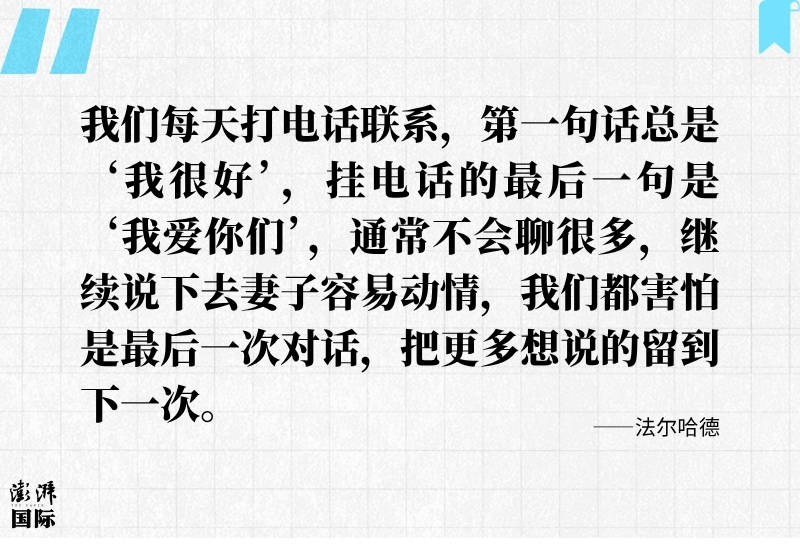 新年之际,穆罕默德已经有好几天联系不上家人,焦虑不已。而法尔哈德和妻子、孩子也没能团聚,但都还平安。他说:“我们每天打电话联系,第一句话总是‘我很好’,挂电话的最后一句是‘我爱你们’,通常不会聊很多,继续说下去妻子容易动情,我们都害怕是最后一次对话,把更多想说的留到下一次。”