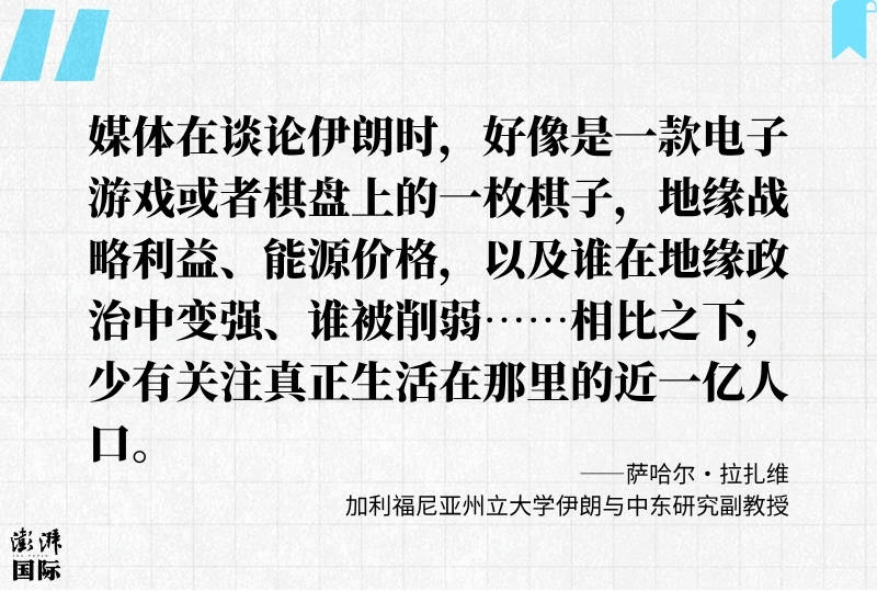 “媒体在谈论伊朗时,好像是一款电子游戏或者棋盘上的一枚棋子,地缘战略利益、能源价格,以及谁在地缘政治中变强、谁被削弱……相比之下,少有关注真正生活在那里的近一亿人口。”加利福尼亚州立大学伊朗与中东研究副教授萨哈尔·拉扎维对澎湃新闻说,她也有家人在伊朗,希望人们用更长的历史视角看待这个国家,更多关注伊朗人民的声音和愿望。